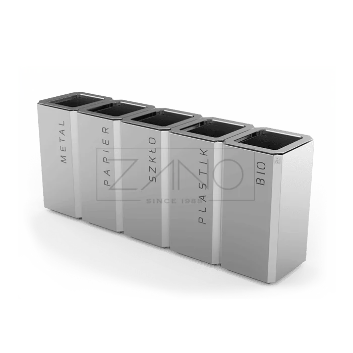 De afvalbak is uitgevoerd in RVS (1.4301) of staal (S235JR) en is voorzien van vijf uitneembare binnenbakken van elk 69 liter. De bovenklep opent naar achteren, waardoor de bakken eenvoudig bereikbaar en gebruiksvriendelijk zijn.