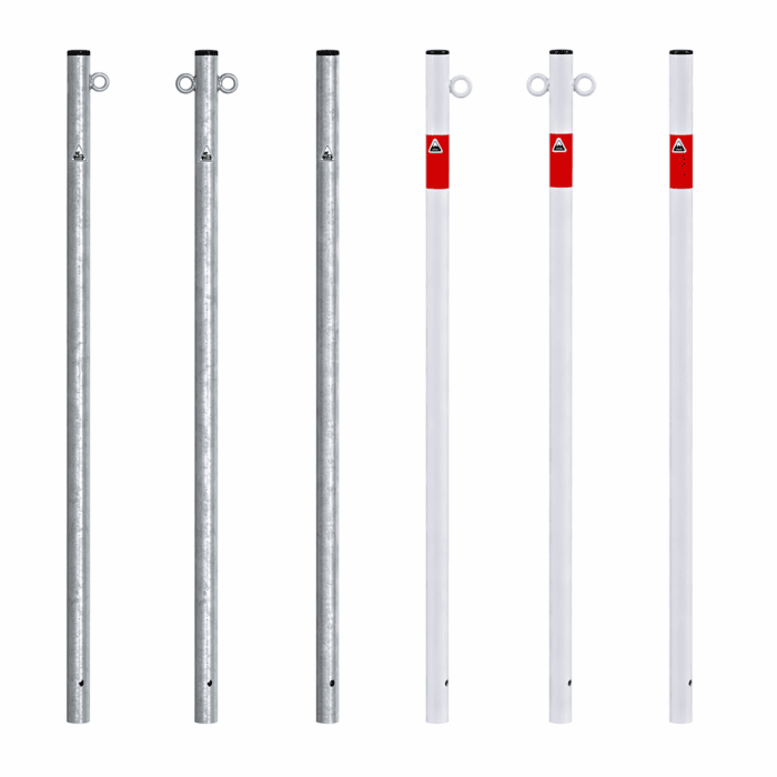 Afhankelijk van de toepassing is de paal verkrijgbaar in verschillende uitvoeringen: zonder oog, met 1 oog of met 2 ogen, ideaal voor het bevestigen van kettingen of afzettingen.