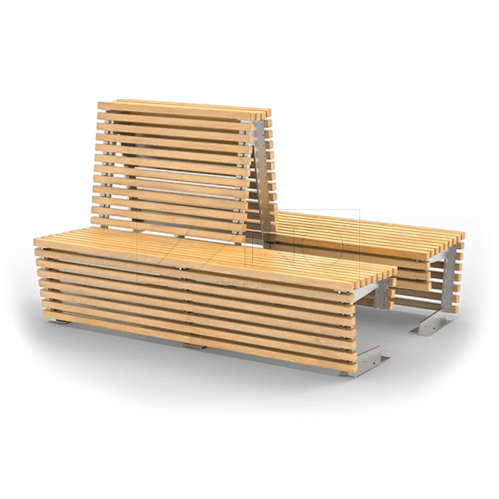 De bank is uitgevoerd in RVS (1.4301) of staal (S235JR) en voorzien van houten delen in Europees naaldhout, Europees hardhout, exotisch hout, premium exotisch hout of eco-plank. Dankzij de combinatie van een stevige stalen constructie en houten afwerking biedt deze bank zowel comfort als een moderne uitstraling.