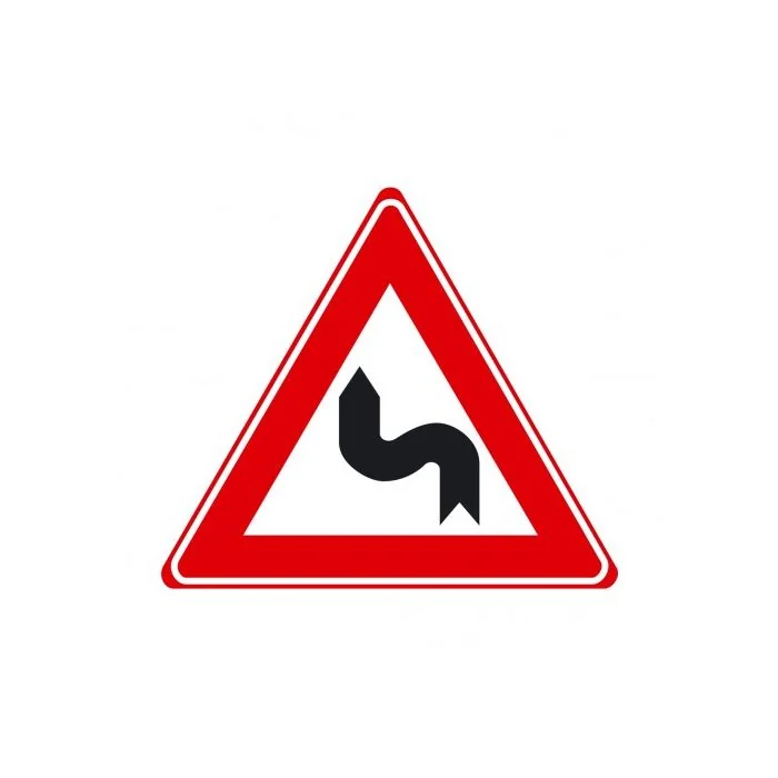 Verkeersbord J05 Waarschuwing S-bocht eerst naar links Reflectieklasse 3 Standaard afmeting driehoek 70 cm Leverbaar in afmeting driehoek 70 cm, 90 cm en 110 cm Dubbel Omgezette Rand