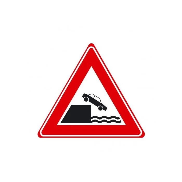 Verkeersbord J26 Waarschuwing kade of rivieroever Reflectieklasse 3 Standaard afmeting driehoek 70 cm Leverbaar in afmeting driehoek 70 cm, 90 cm en 110 cm Dubbel Omgezette Rand