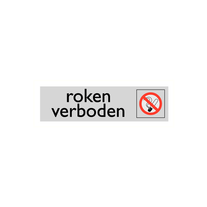 Deurbord “Roken verboden” Kunststof bord (PVC) met aluminium look Voorzien van een dunne dubbelzijdige kleefstrook Leverbaar in de afmeting 165 x 45 mm Dikte 1 mm