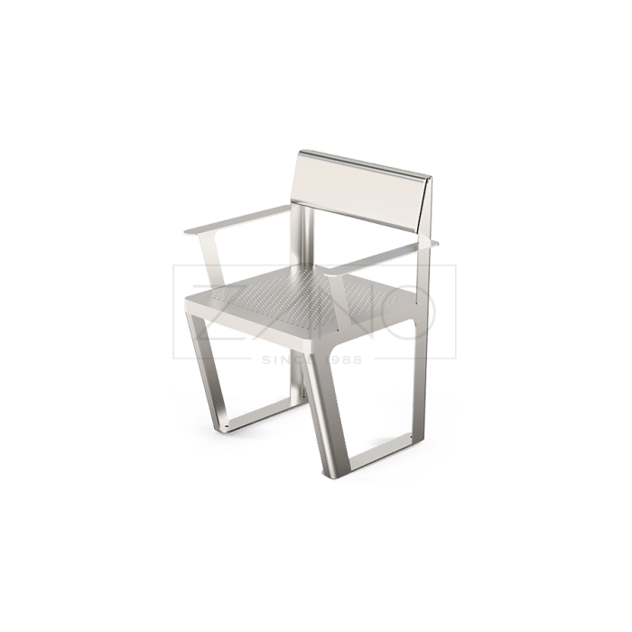 De Scandik metalen stoel met armleuningen is een moderne en robuuste zitoplossing voor openbare ruimtes. Dankzij het minimalistische design en de volledig stalen uitvoering past deze stoel perfect in parken, pleinen, wachtruimtes en andere stedelijke omgevingen. De constructie is uitgevoerd in RVS (1.4301) of staal (S235JR), waarbij de stalen variant thermisch verzinkt en gepoedercoat wordt in een RAL-kleur naar keuze. De zitting is afgewerkt met geperforeerde staalplaat met openingen van 8 mm, wat zorgt voor een eigentijdse uitstraling en optimale waterafvoer. De toevoeging van armleuningen zorgt voor extra comfort en maakt de stoel bijzonder geschikt voor langdurig gebruik. De Scandik stoel met armleuningen is ontworpen voor intensief buitengebruik en combineert duurzaamheid met gebruiksgemak.