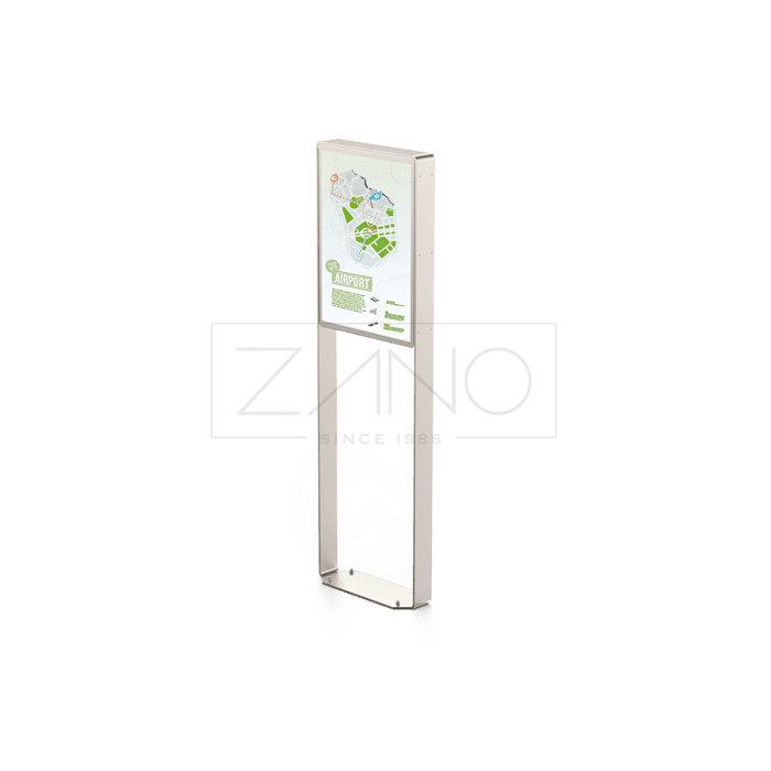 De constructie is uitgevoerd in RVS (1.4301) of staal (S235JR), waarbij de stalen variant thermisch verzinkt en gepoedercoat wordt in een RAL-kleur naar keuze. Het paneel is voorzien van een stevige plaat, geschikt voor het aanbrengen van grafische folies.