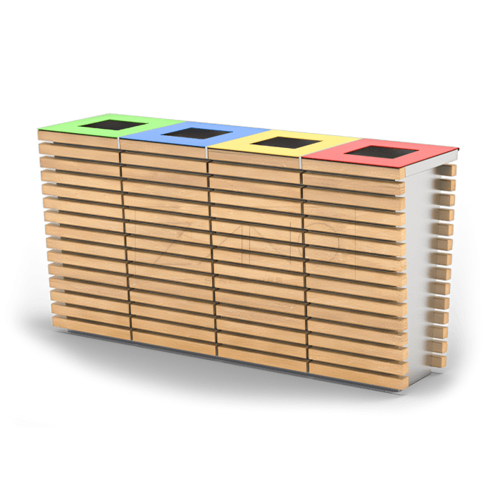 De afvalbak is uitgevoerd in RVS (1.4301) of staal (S235JR) en afgewerkt met houten delen in Europees naaldhout of exotisch hout. De bak is voorzien van vier afzonderlijke binnenbakken van elk 65 liter, waardoor afval eenvoudig en overzichtelijk gescheiden kan worden ingezameld.