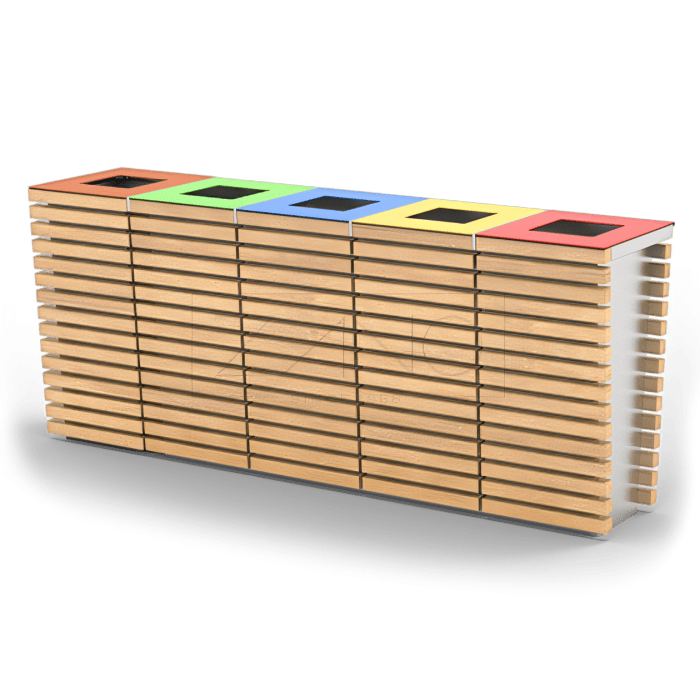 De afvalbak is uitgevoerd in RVS (1.4301) of staal (S235JR) en voorzien van een omkasting in Europees naaldhout, Europees hardhout, exotisch hout, premium exotisch hout, HPL-plaat of eco-plank. De bak beschikt over vijf afzonderlijke binnenbakken van elk 75 liter, waardoor afval eenvoudig en overzichtelijk gescheiden kan worden ingezameld.