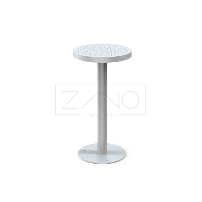 De Scandik hoge statafel is een moderne en robuuste tafel, ideaal voor gebruik met barkrukken in openbare ruimtes en horecagelegenheden. Dankzij het strakke ontwerp en de volledig stalen uitvoering past deze tafel perfect in terrassen, pleinen en andere buitenomgevingen. De constructie is uitgevoerd in RVS (1.4301) of staal (S235JR), waarbij de stalen variant thermisch verzinkt en gepoedercoat wordt in een RAL-kleur naar keuze. Het tafelblad is afgewerkt met geperforeerde staalplaat met openingen van 8 mm, wat zorgt voor een moderne uitstraling en een goede waterafvoer. De stevige centrale poot met ronde voet zorgt voor stabiliteit en maakt de tafel geschikt voor intensief gebruik, zowel binnen als buiten.