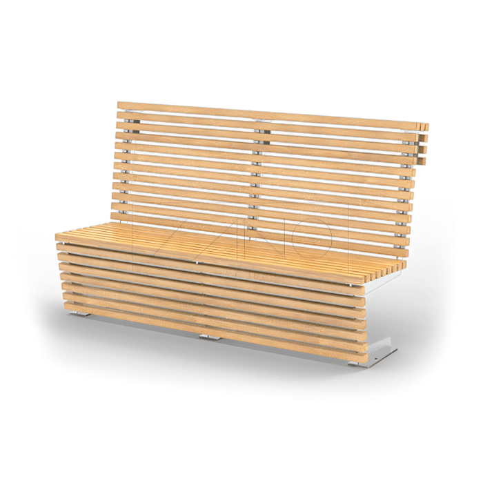 De bank is uitgevoerd in RVS (1.4301) of staal (S235JR) en afgewerkt met houten latten van Europees naaldhout of exotisch hout. Zowel de zitting als de rugleuning zijn opgebouwd uit houten planken met een strakke, moderne uitstraling, wat zorgt voor een comfortabele en stijlvolle zitoplossing.