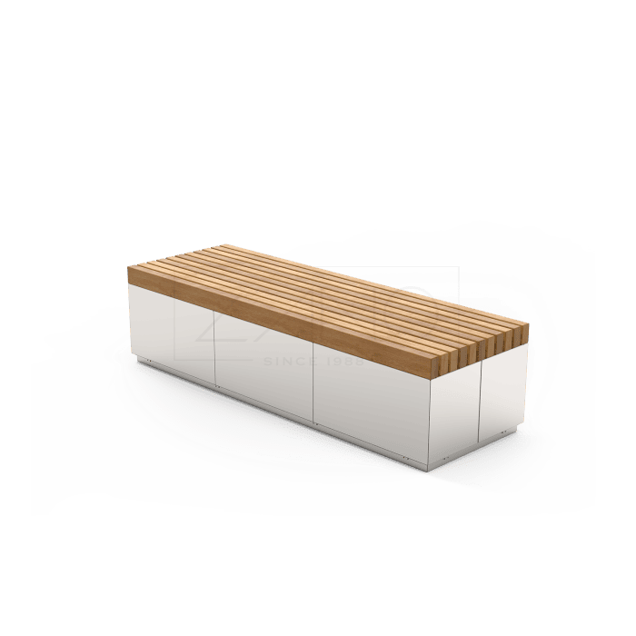 De bank is voorzien van een sterke stalen constructie en een zitting van houten planken, wat zorgt voor een duurzame, robuuste en hoogwaardige afwerking.