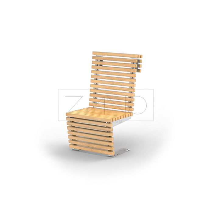 De fauteuil is uitgevoerd in RVS (1.4301) of staal (S235JR) en voorzien van houten delen in Europees naaldhout of exotisch hout. Zowel de zitting als de rugleuning zijn opgebouwd uit meerdere houten planken, wat zorgt voor een ergonomische zit en een warme, natuurlijke uitstraling.