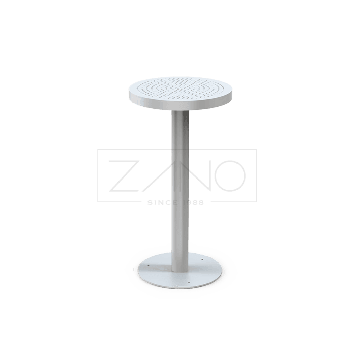 De Scandik hoge statafel is een moderne en robuuste tafel, ideaal voor gebruik met barkrukken in openbare ruimtes en horecagelegenheden. Dankzij het strakke ontwerp en de volledig stalen uitvoering past deze tafel perfect in terrassen, pleinen en andere buitenomgevingen. De constructie is uitgevoerd in RVS (1.4301) of staal (S235JR), waarbij de stalen variant thermisch verzinkt en gepoedercoat wordt in een RAL-kleur naar keuze. Het tafelblad is afgewerkt met geperforeerde staalplaat met openingen van 8 mm, wat zorgt voor een moderne uitstraling en een goede waterafvoer. De stevige centrale poot met ronde voet zorgt voor stabiliteit en maakt de tafel geschikt voor intensief gebruik, zowel binnen als buiten.